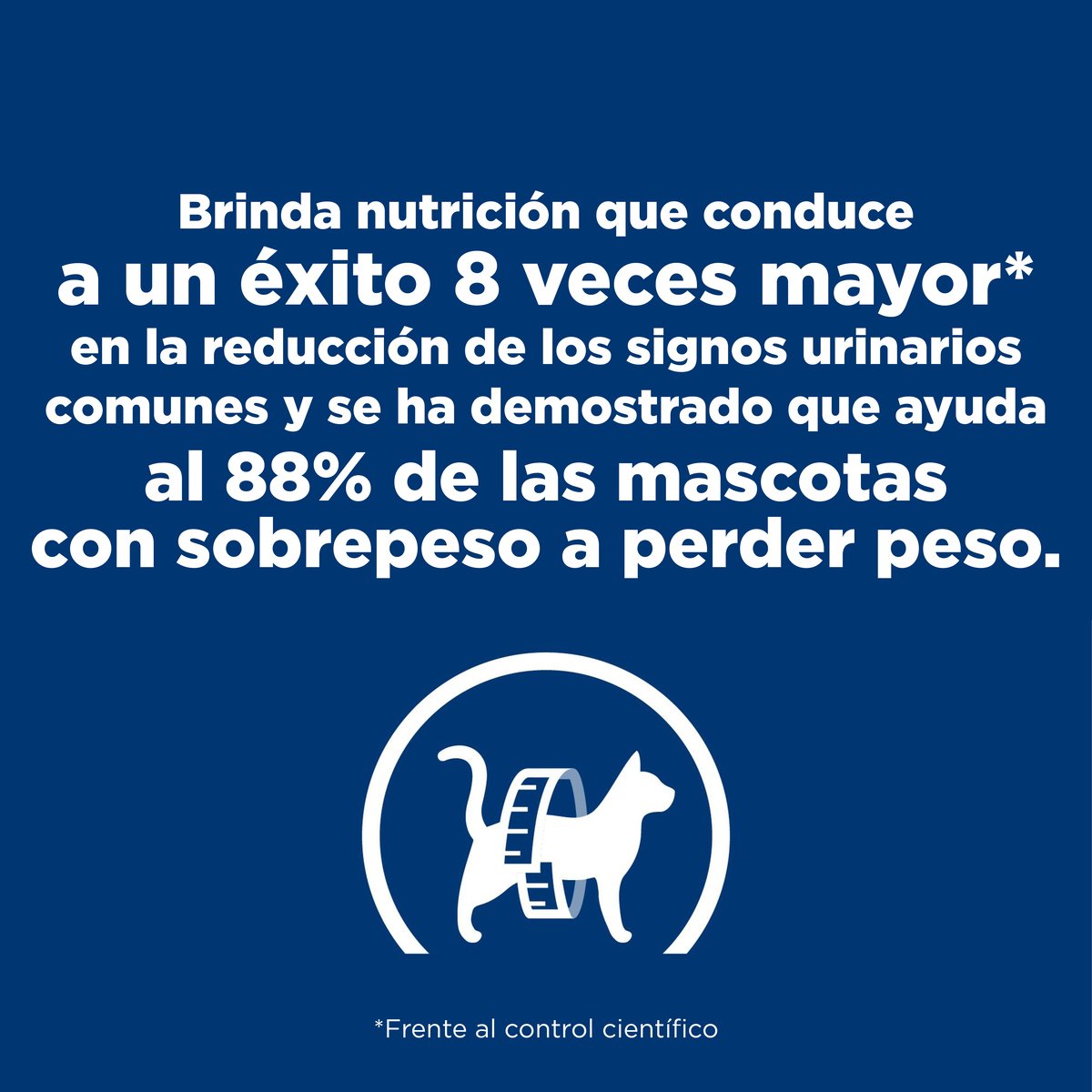 Los nutriólogos y veterinarios de Hill’s desarrollaron la nutrición clínica Prescription Diet® Metabolic + Urinary Feline formulada para ayudar a manejar el peso y salud urinaria de su gato. De hecho, Metabolic + Urinary Feline tiene nutrición clínicamente probada para reducir la mayoría de los signos urinarios más comunes en un 89% Y comprobada para reducir el peso corporal en un 11% en 60 días. Cómo funciona: Una mezcla sinérgica de ingredientes Niveles controlados de magnesio, calcio y fósforo Mezcla única de fibras de frutas y vegetales Cómo ayuda: Trabaja naturalmente con el metabolismo único de su mascota Disuelve las piedras de estruvita en tan sólo 7 días (Promedio 27 días) Ayuda a su mascota a sentirse llena y satisfecha entre comidas.
