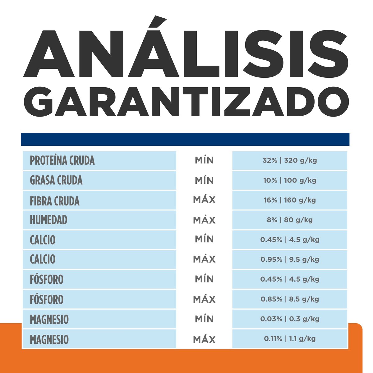 Hill’s® Prescription Diet® Metabolic + Urinary Feline proporciona toda la nutrición que su gato necesita durante la pérdida y mantenimiento del peso a la vez que mejora la salud urinaria. Por favor consulte a su veterinario para mayor información sobre cómo pueden los alimentos Prescription Diet® ayudar a su gato para disfrutar una vida feliz y activa. Mezcla exclusiva de nutrientes sinérgicamente efectivos Alto Proporcionar regulación del apetito, reducir la inflamación y mejorar el metabolismo de la energía. Paquete antioxidante Alto La vitamina E y beta caroteno ayudan a defender las células contra la oxidación de los radicales libres y contrarrestar la inflamación. Fibra Alto Fibra soluble e insoluble para provocar saciedad, controlar el apetito y mantener la salud del tracto gastrointestinal. Magnesio, calcio y fósforo Niveles controlados Reducir los elementos constitutivos de cristales y urolitos. Citrato de potasio Añadido Inhibir los cristales y urolitos de oxalato de calcio Ácidos grasos esenciales EPA y DHA Alto Ayudar a romper el ciclo inflamatorio asociado con los urolitos, cristales y CIF pH urinario objetivo* 6.2 – 6.4 Desalentar la formación de estruvita con efecto mínimo en la formación de oxalato de calcio *el pH urinario de gatos individuales puede variar debido a factores de complicación como tiempo de alimentación previo a la recolección de la orina, tipo de recolección, variaciones individuales del animal y metodología de la prueba. Control de peso Peso ideal del gato Disminución de peso Control del peso 2 kg 30 g 45 g 3 kg 40 g 60 g 4 kg 50 g 70 g 5 kg 55 g 85 g 6 kg 65 g 100 g 7 kg 75 g 110 g Administrar a su mascota la cantidad correcta de Metabolic + Urinary cada día le ayudará a alcanzar y mantener un peso sano de por vida así como a tener una mejor salud urinaria. Si tiene dudas, consulte a su veterinario. Para mejores resultados y prácticas de seguridad: Haga una transición gradual hacia el alimento nuevo de su mascota en un periodo de 7 días. Administre exclusivamente el alimento seco, enlatado y premios de Prescription Diet recomendado. Mantenga agua fresca disponible en todo momento. Haga que su veterinario monitoree la condición de su mascota. Para prevenir asfixia, mantenga el empaque fuera del alcance de mascotas y niños 3289 kcal/kg (289 kcal/cup†) Nutriente Materia Seca1% Proteína 38.1 Grasa 12.9 Fibra bruta 13.2 Carbohidratos (ELN) 30.5 Calcio 0.70 Phosphorous 0.60 Sodio 0.33 Potasio 0.88 Magnesio 0.075 Taurina 0.46 Vitamina E 748 IU/kg Ácidos grasos omega-3 1.35.