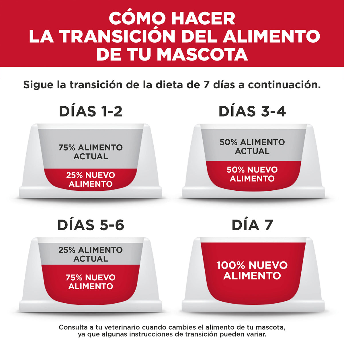 Ajuste la cantidad de alimento según sea necesario para mantener el peso óptimo. Si tiene dudas, consulte a su veterinario. ¿Nuevo en este alimento? Mezcle cantidades cada vez mayores del alimento nuevo de su mascota con cantidades cada vez menores del alimento anterior durante un periodo de 7 días. ¡Mantenga agua fresca disponible en todo momento! Las necesidades nutricionales de su mascota pueden cambiar con la edad. Pregunte a su veterinario en cada revisión. Para prevenir asfixia, mantenga el empaque fuera del alcance de mascotas y niños.
