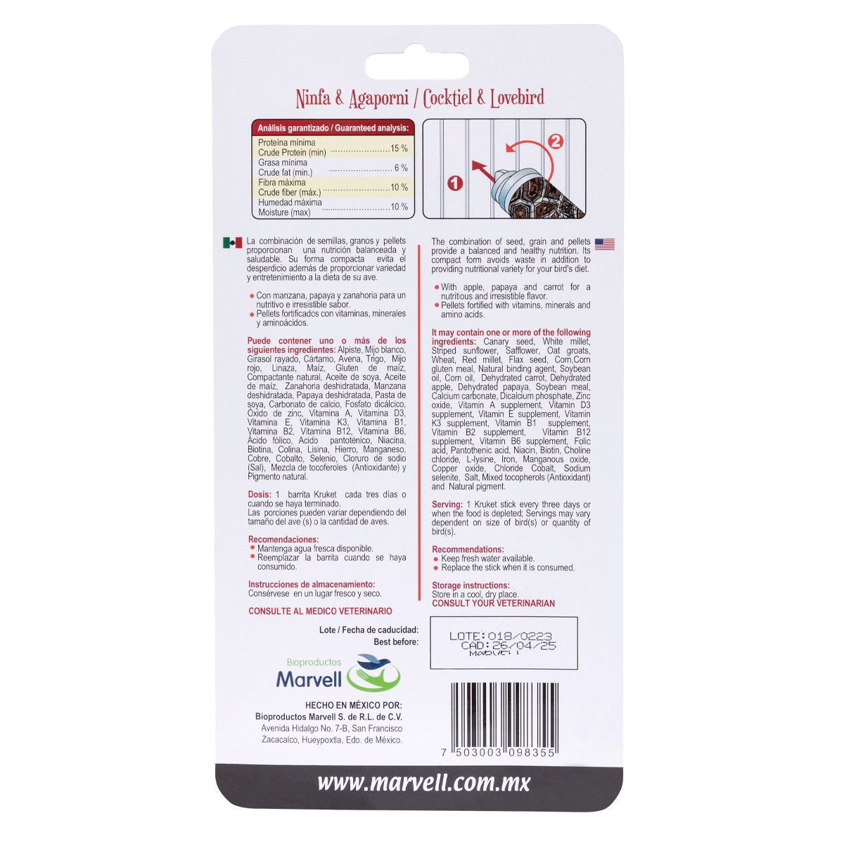 Krukets Ninfa & Agaporni 90 g, barritas crujientes con semillas, granos y pellets que proporcionan una nutrición balanceada y saludable. Su forma compacta evita el desperdicio además permite dar variedad a la dieta de su ave y proporciona entretenimiento.