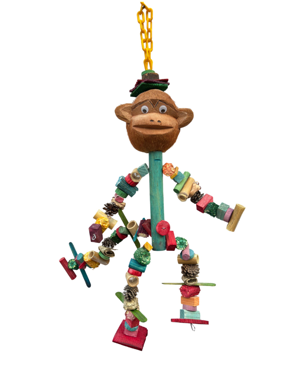 ¡Diversión XL para tus aves con el Juguete Mico! Con sus impresionantes 60 cm de altura, este changuito hecho de cabeza de coco con sombrero es más que un juguete, es una aventura colgante que encantará a tu ave.