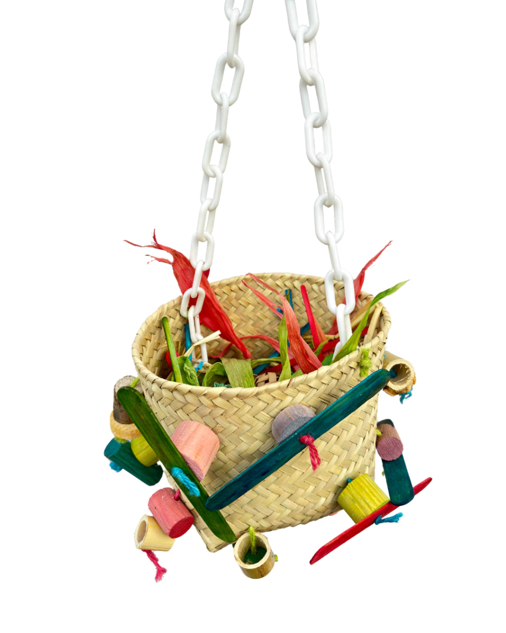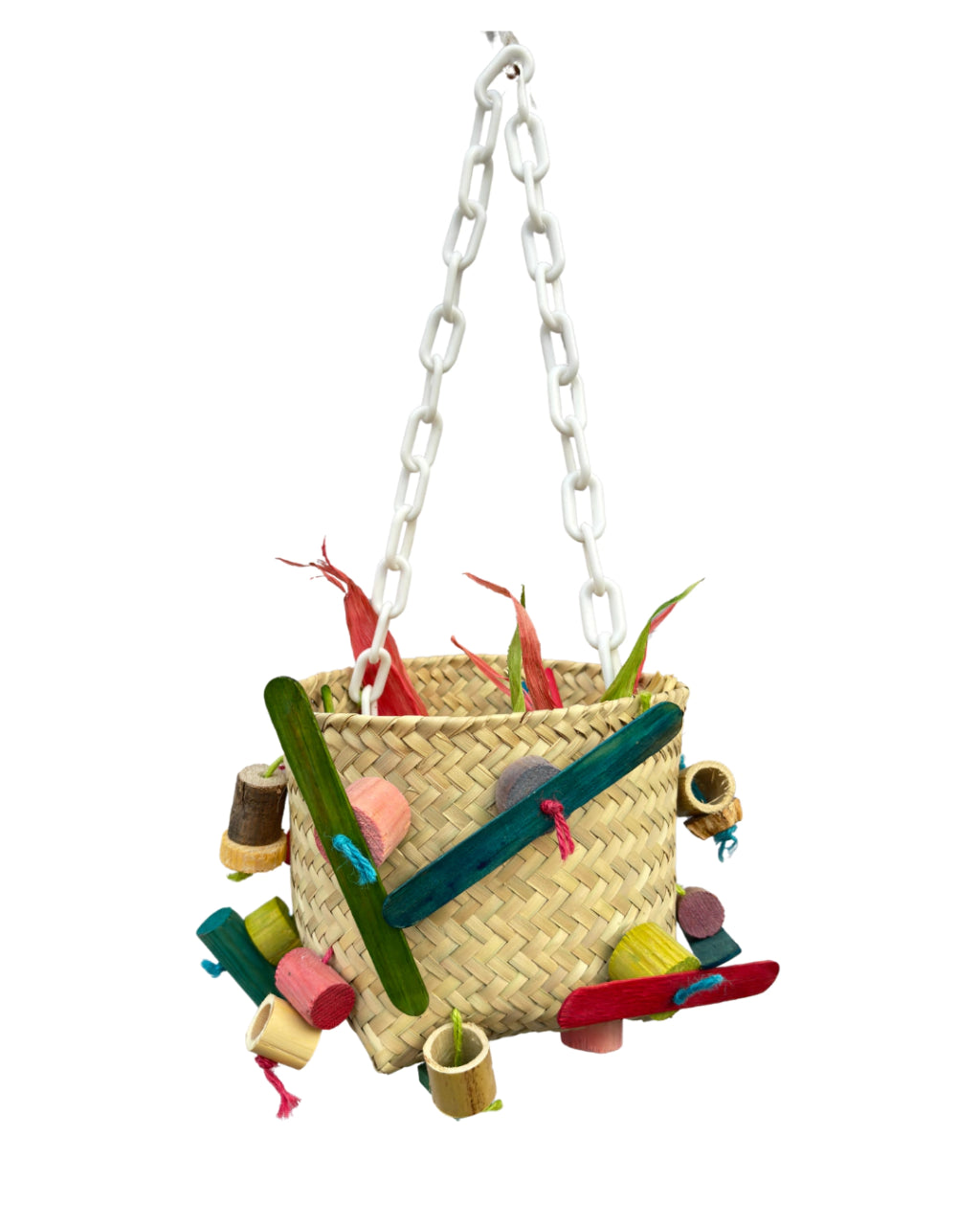 Incluye una cadena resistente para colgarse fácilmente dentro del espacio de vuelo o jaula, garantizando que tus aves tengan su refugio ideal donde jugar y descansar.